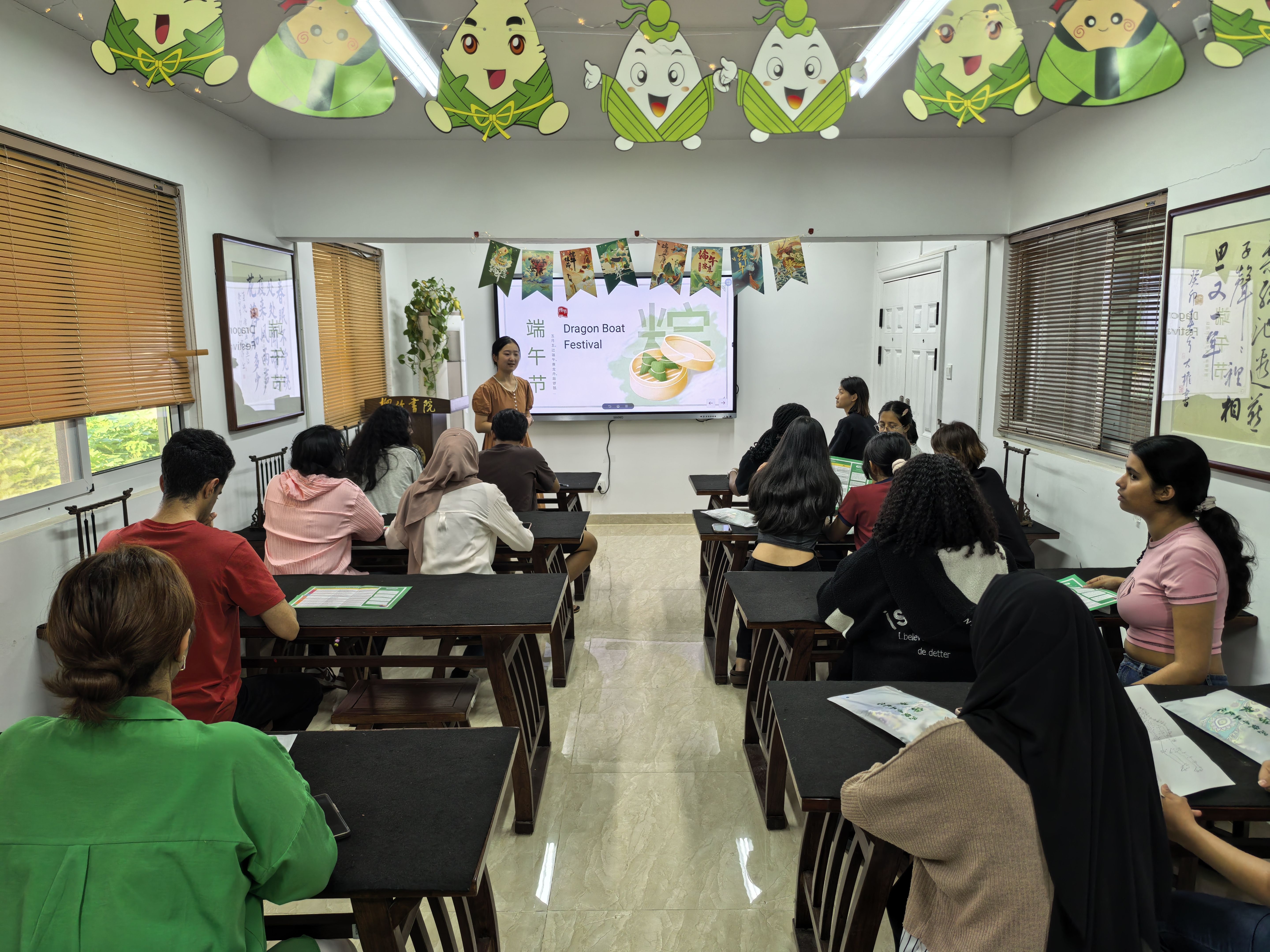 本次活动围绕端午节的传统习俗展开。邀请了外国语学院学生进行端午文化讲座,讲解端午节起源、传说、习俗等传统意义和丰富的文化内涵。