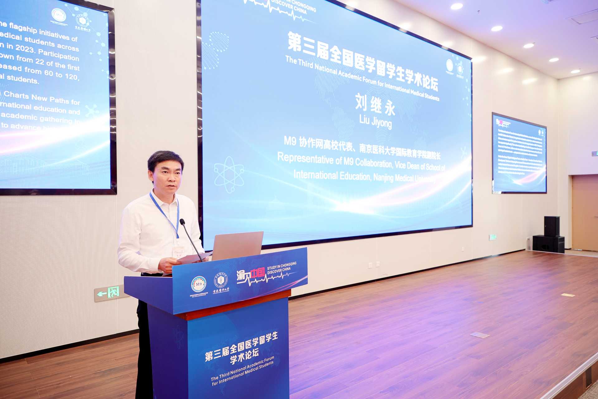 全国医学留学生学术论坛由南京医科大学于2023年发起并连续举办两届,今年由重庆医科大学接续举办,我校国际教育学院副院长刘继永作为M9协作网高校代表在开幕式致辞中表示,该论坛目前已成为M9协作网的重要品牌活动之一,是推动来华留学医学教育高质量发展和“留学中国”品牌建设的创新举措,将为构建人类健康命运共同体做出积极贡献。