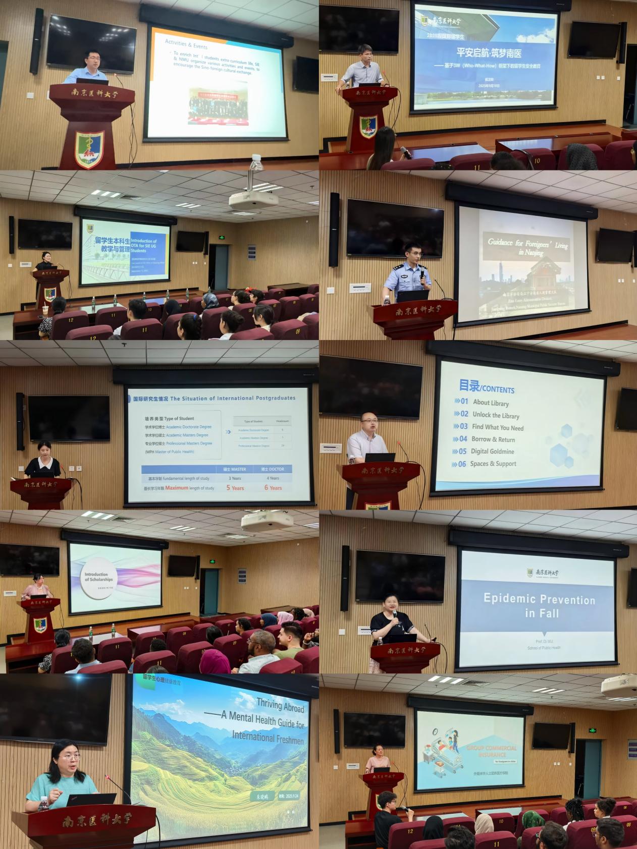 “明规立矩、安心护航”,9月17日,学院特邀中国平安保险公司经理王碧云详解在华医疗保险政策;南京市公安局(出入境管理)警官王晨星解读出入境政策与法律法规、居留许可办理及在华注意事项等;公共卫生学院吴笛教授带来传染病防治科普;心理健康教育专家朱晓鹂教授则分享了文化适应与心理健康的实用策略。9月18日,校保卫处刘少华处长主讲《新生入学安全教育》,为同学们筑牢了校园安全防线;图书馆王云峰老师介绍《图书资源与服务》,引导新生高效利用馆藏,开启学术之门。