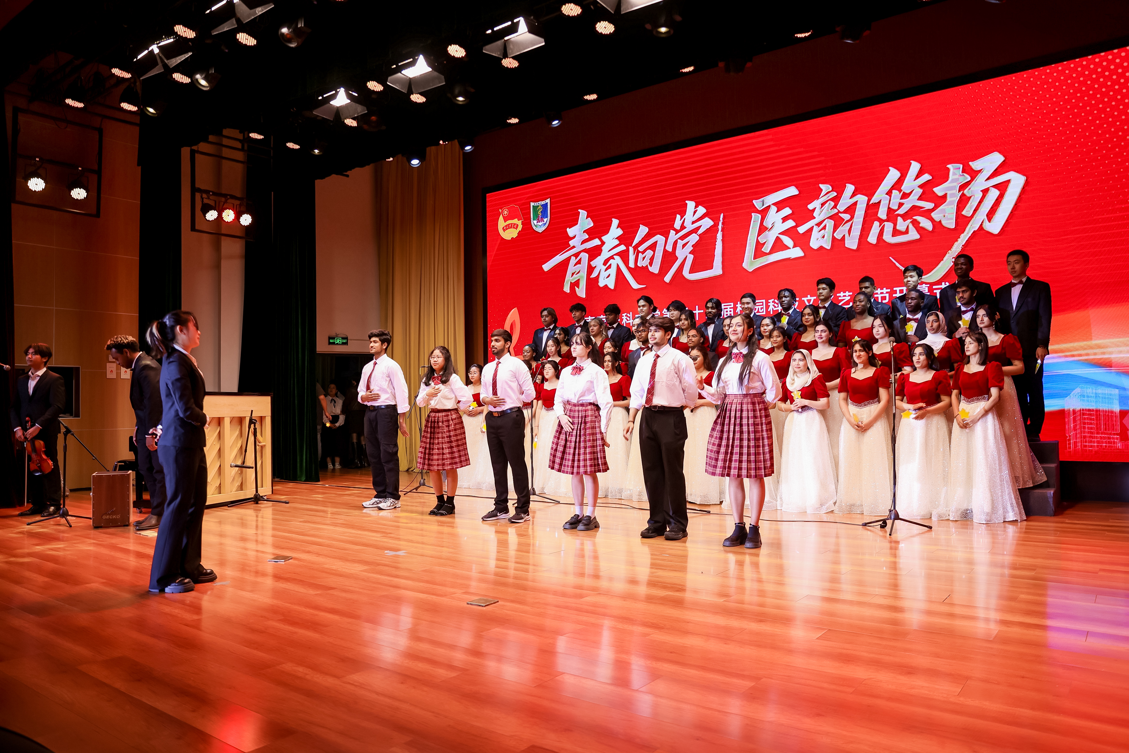 4月20日晚,南京医科大学第三十五届校园科技文化艺术节开幕式暨“青春向党,医韵悠扬”2026年师生合唱比赛于江宁校区大学生活动中心报告厅圆满落幕。我院60名中外师生代表登台献唱,以一曲《明天会更好》传递青春心声,凭借层次饱满的和声演绎、独具巧思的舞台编排,荣获本次比赛一等奖,充分展现了国教学子昂扬向上的精神风采。